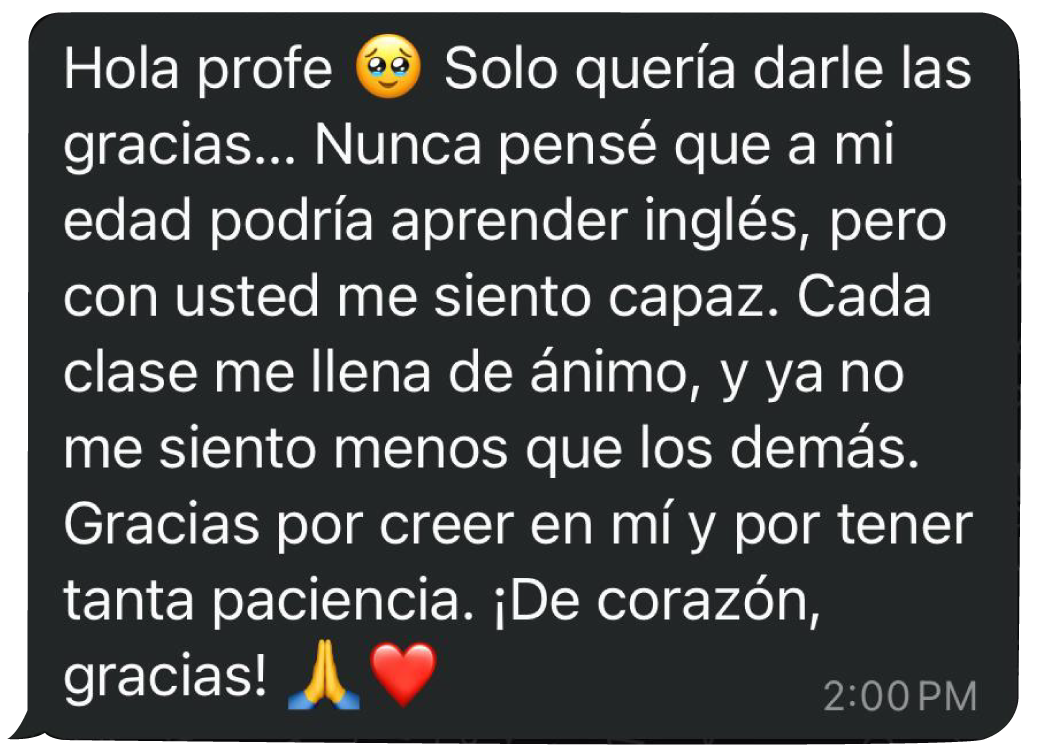Si estás listo(a) para comenzar tu camino hacia el dominio del inglés, estamos aquí para ayudarte. Escríbenos a Inglesproacademy@gmail.com o llámanos al +1(346)273-5442; también puedes dejarnos tu mensaje directamente desde nuestro formulario de contacto. Queremos acompañarte de forma flexible, personalizada y accesible en cada paso de tu aprendizaje.
